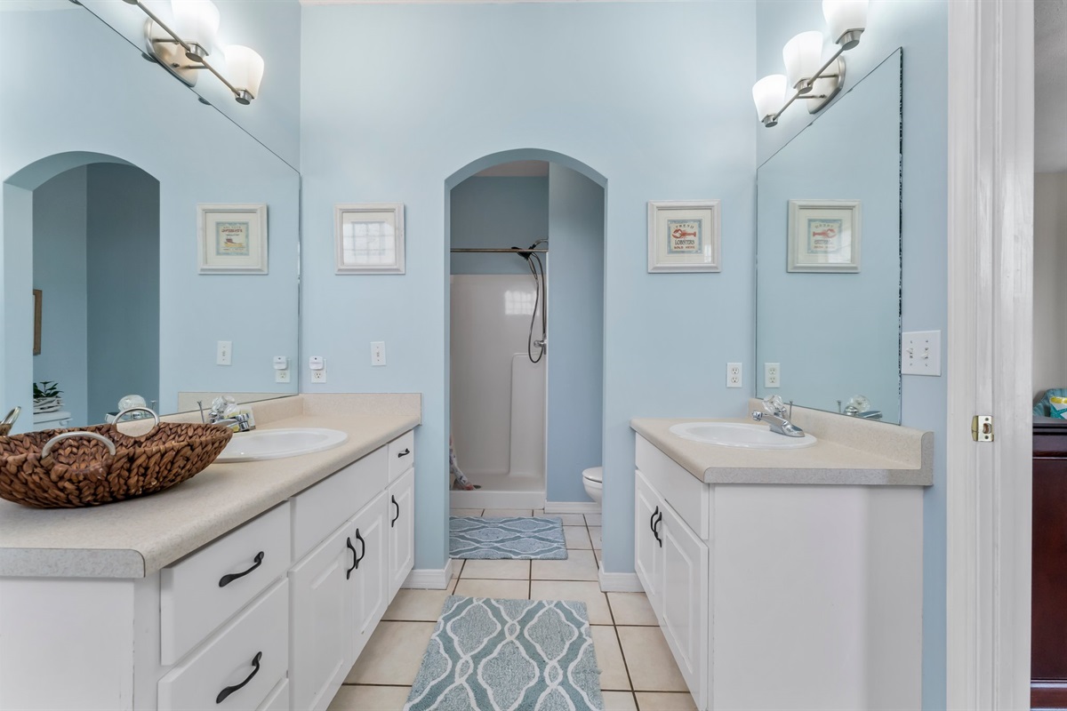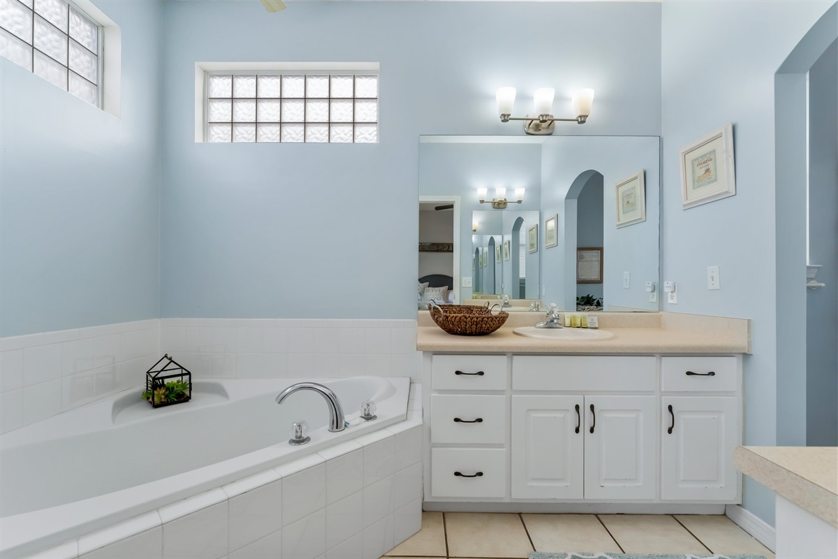 Primary Bedroom with King bed and ensuite bathroom (tub, shower, double vanities with sinks, toilet)