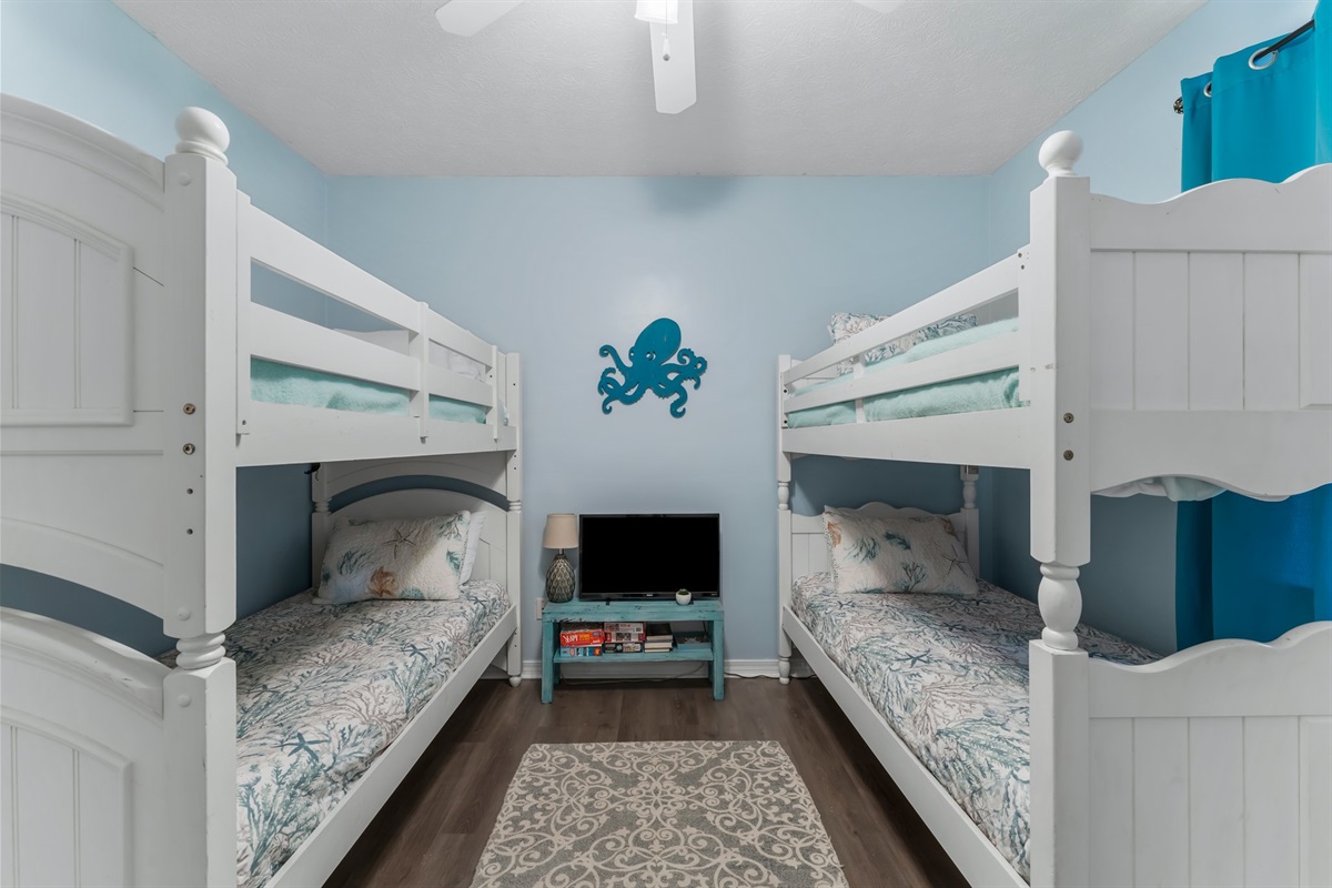 3rd bedroom with 4 single beds in bunk beds (2 sets of 2 single bunk beds)